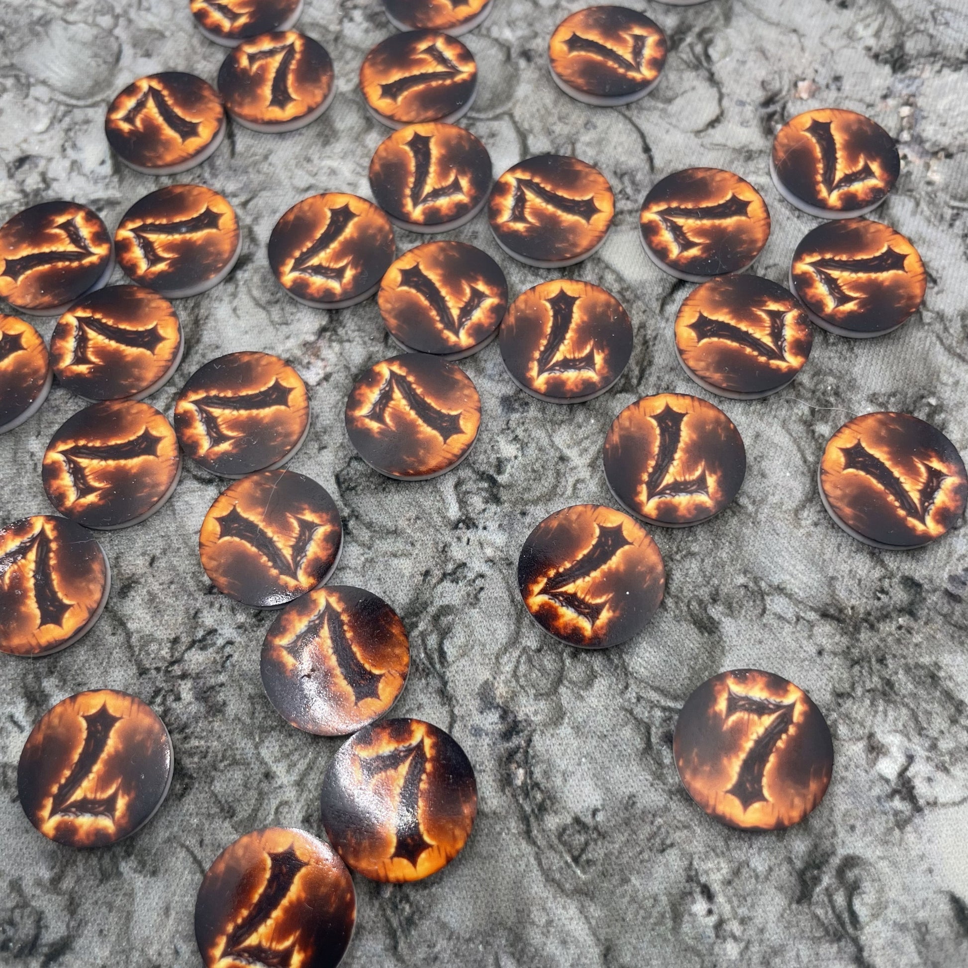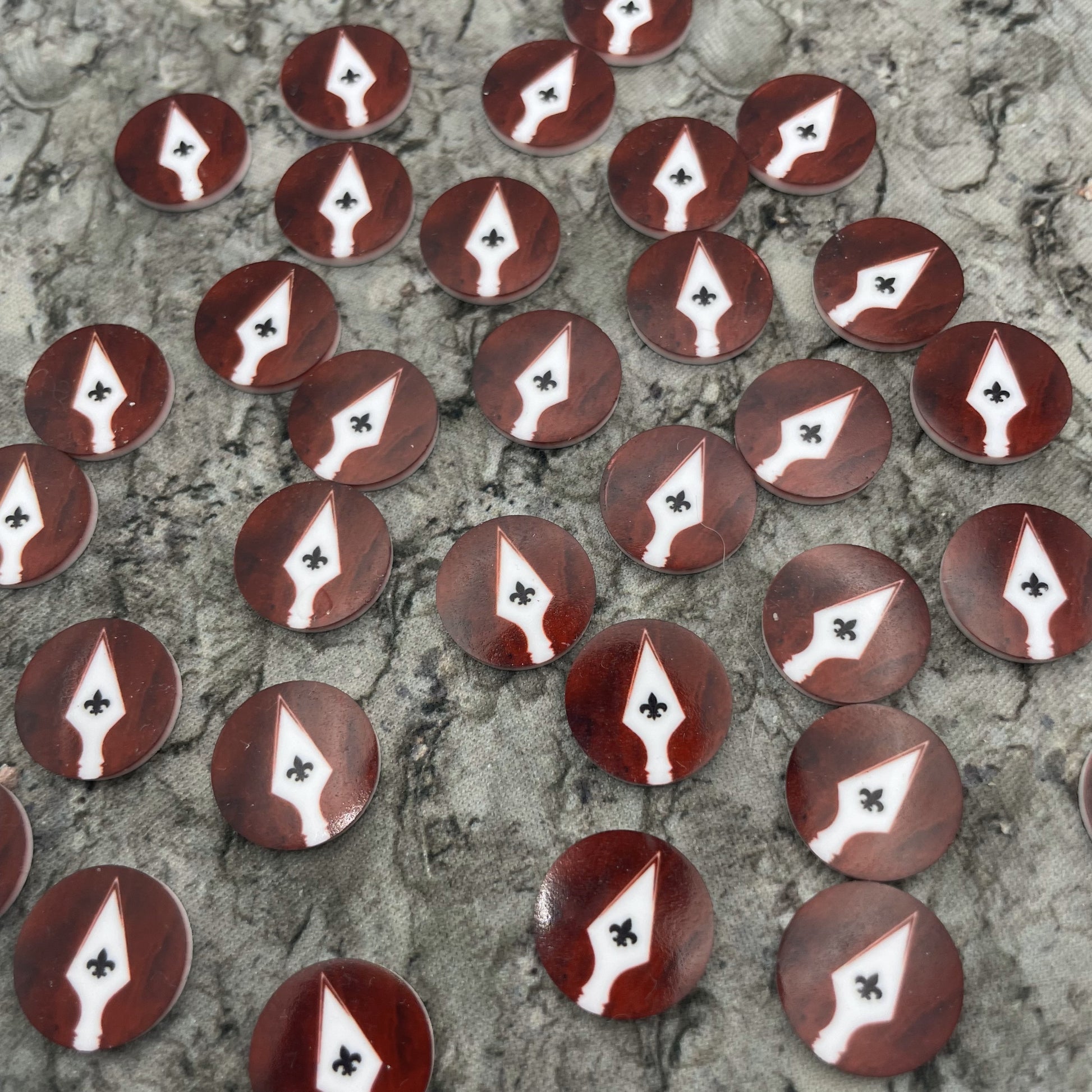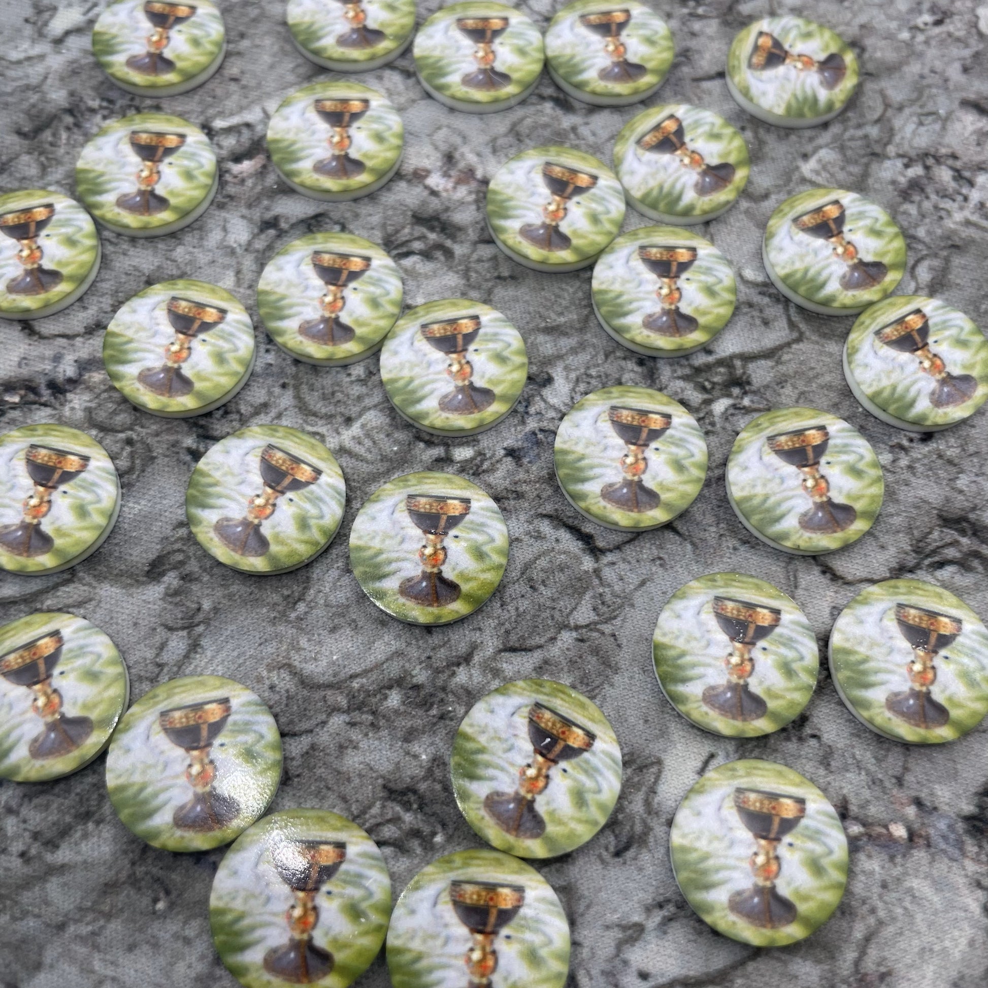 The tokens are 15mm in diameter and have the design printed on one side and a white backing on the other.