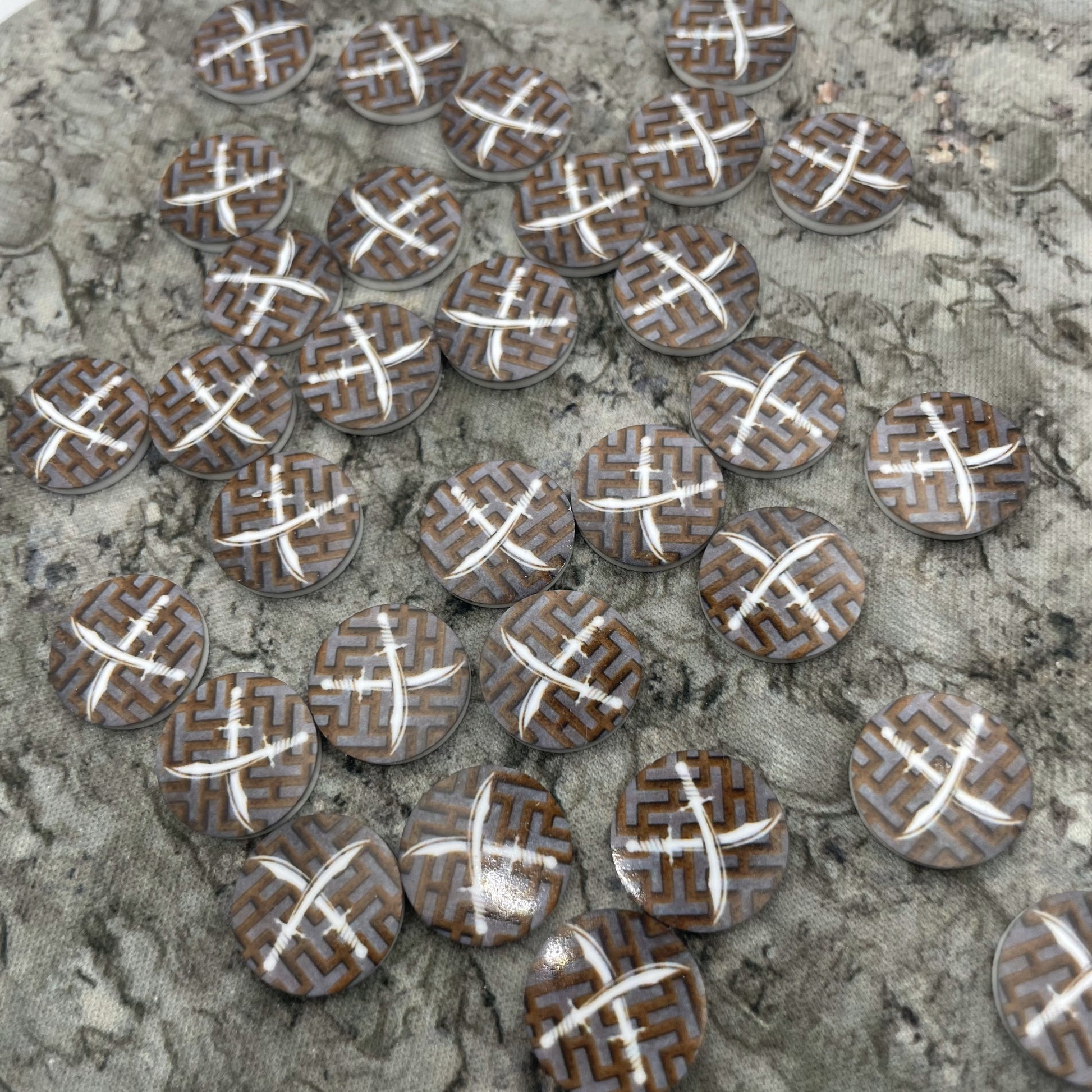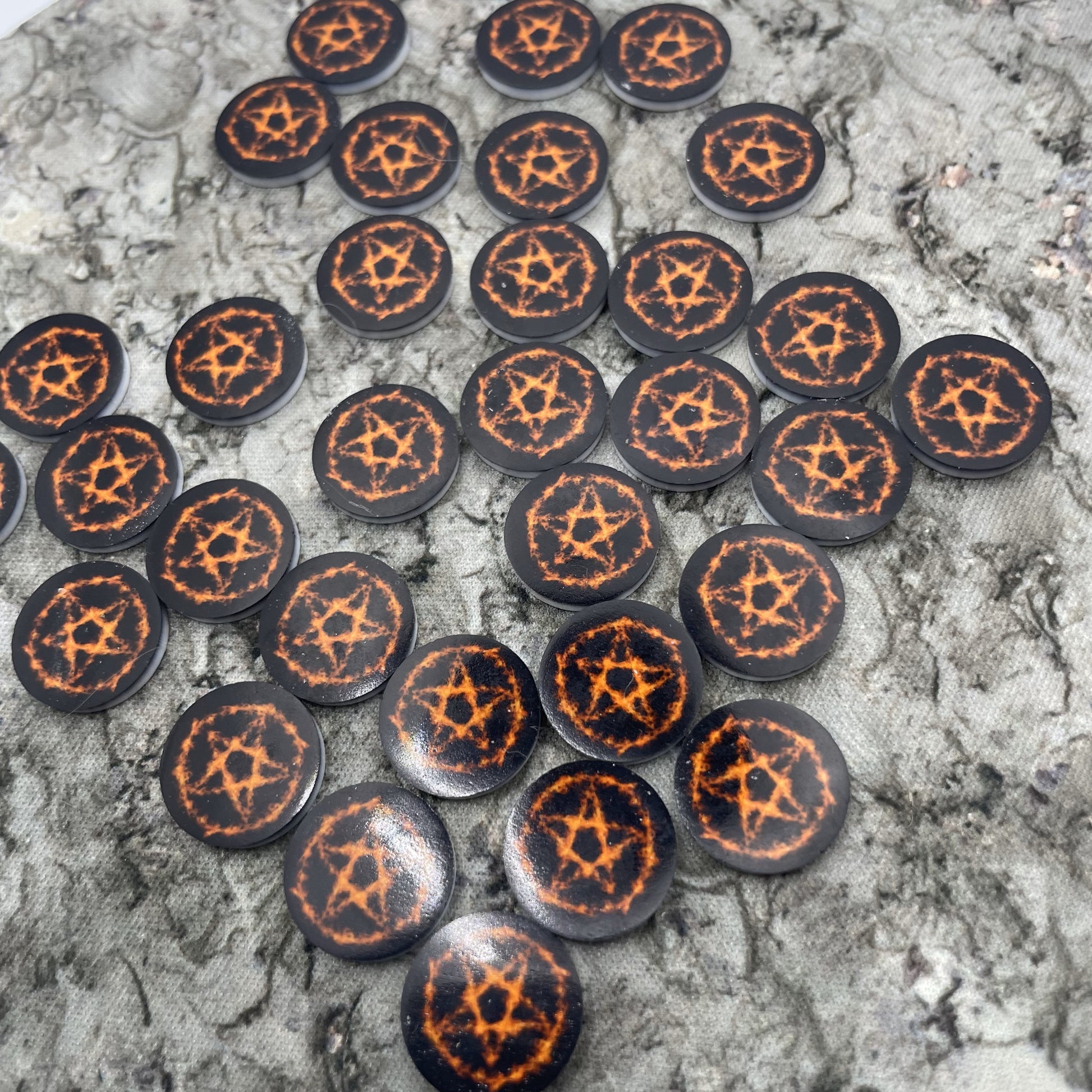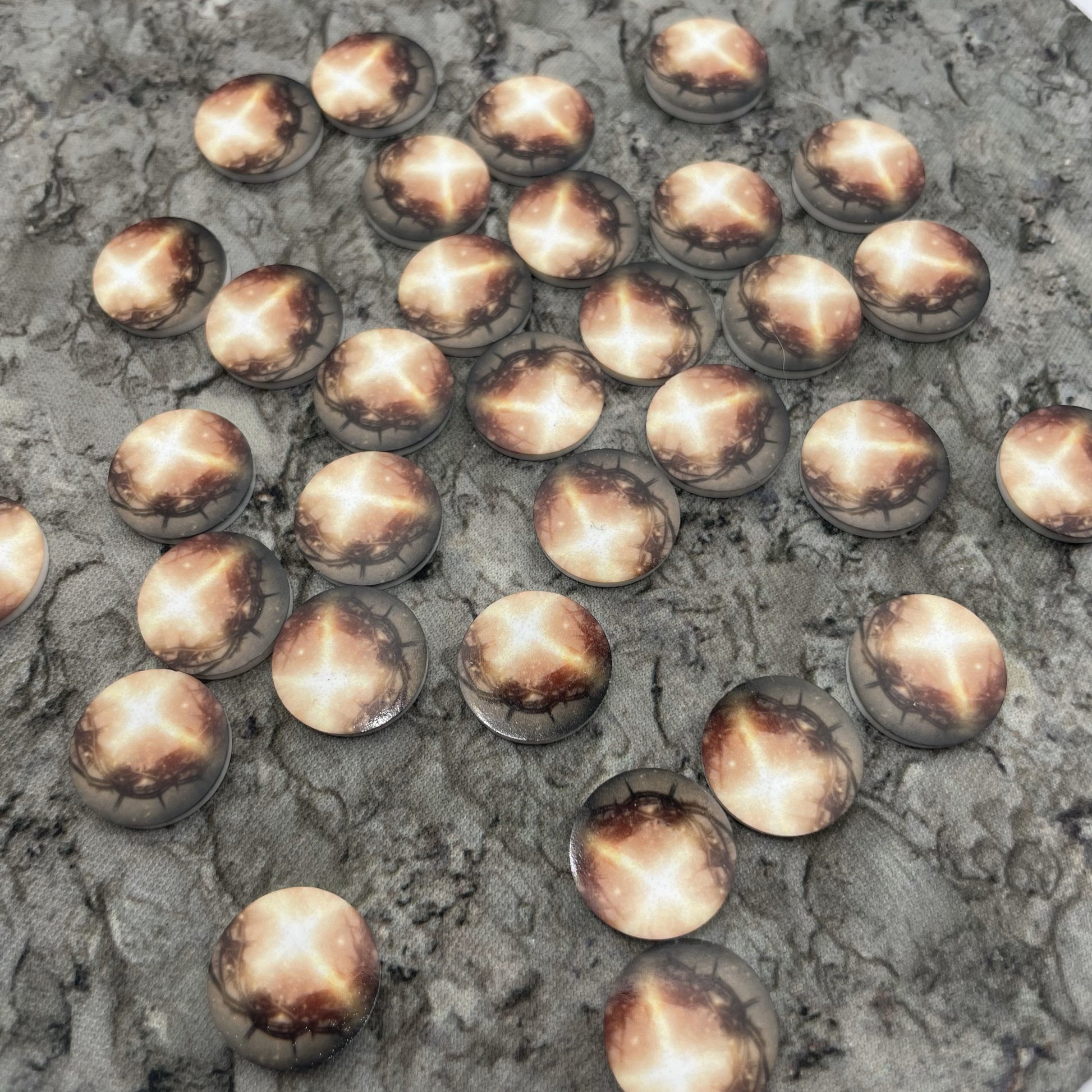 The tokens are 15mm in diameter and have the design printed on one side and a white backing on the other.