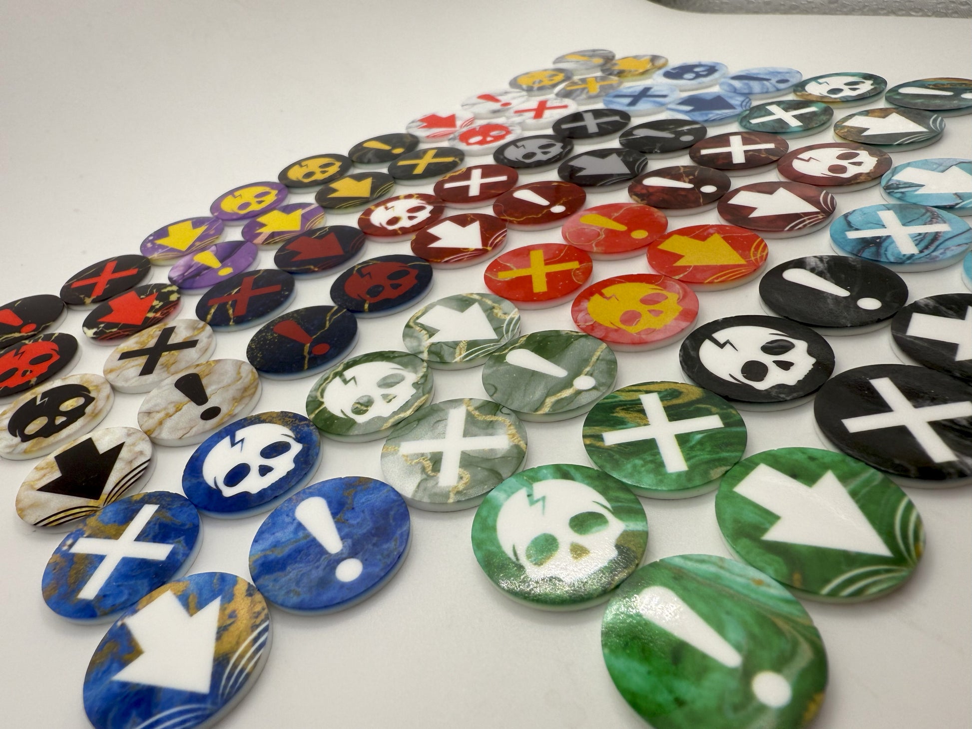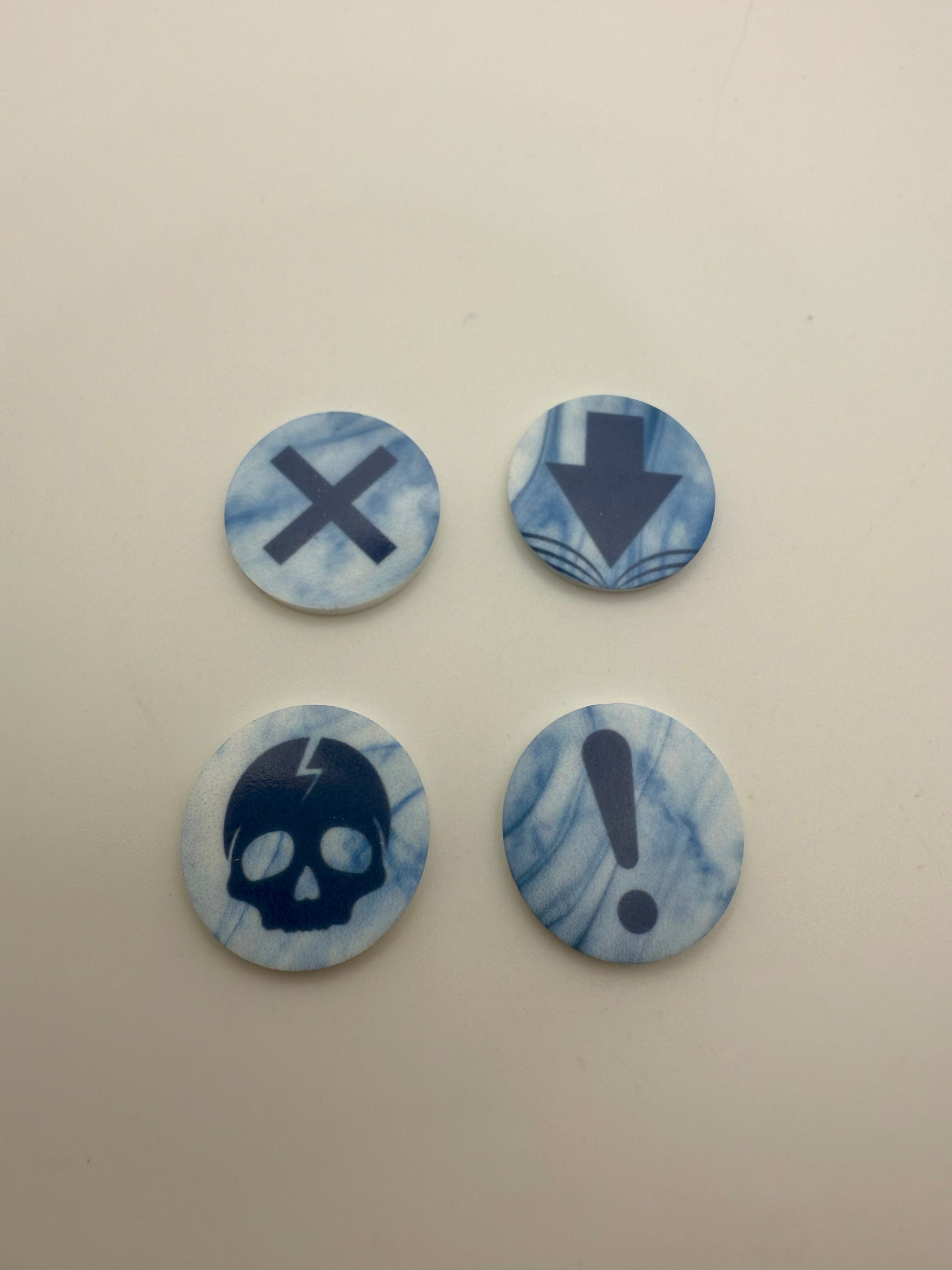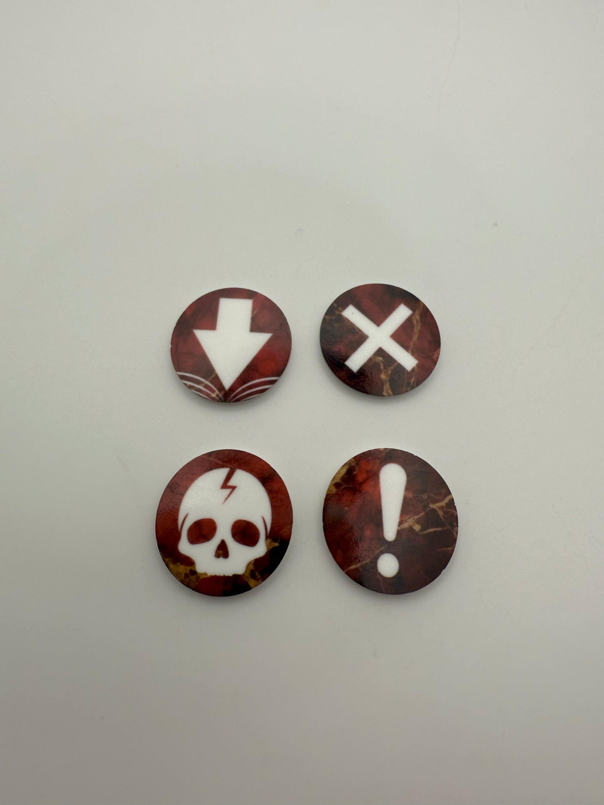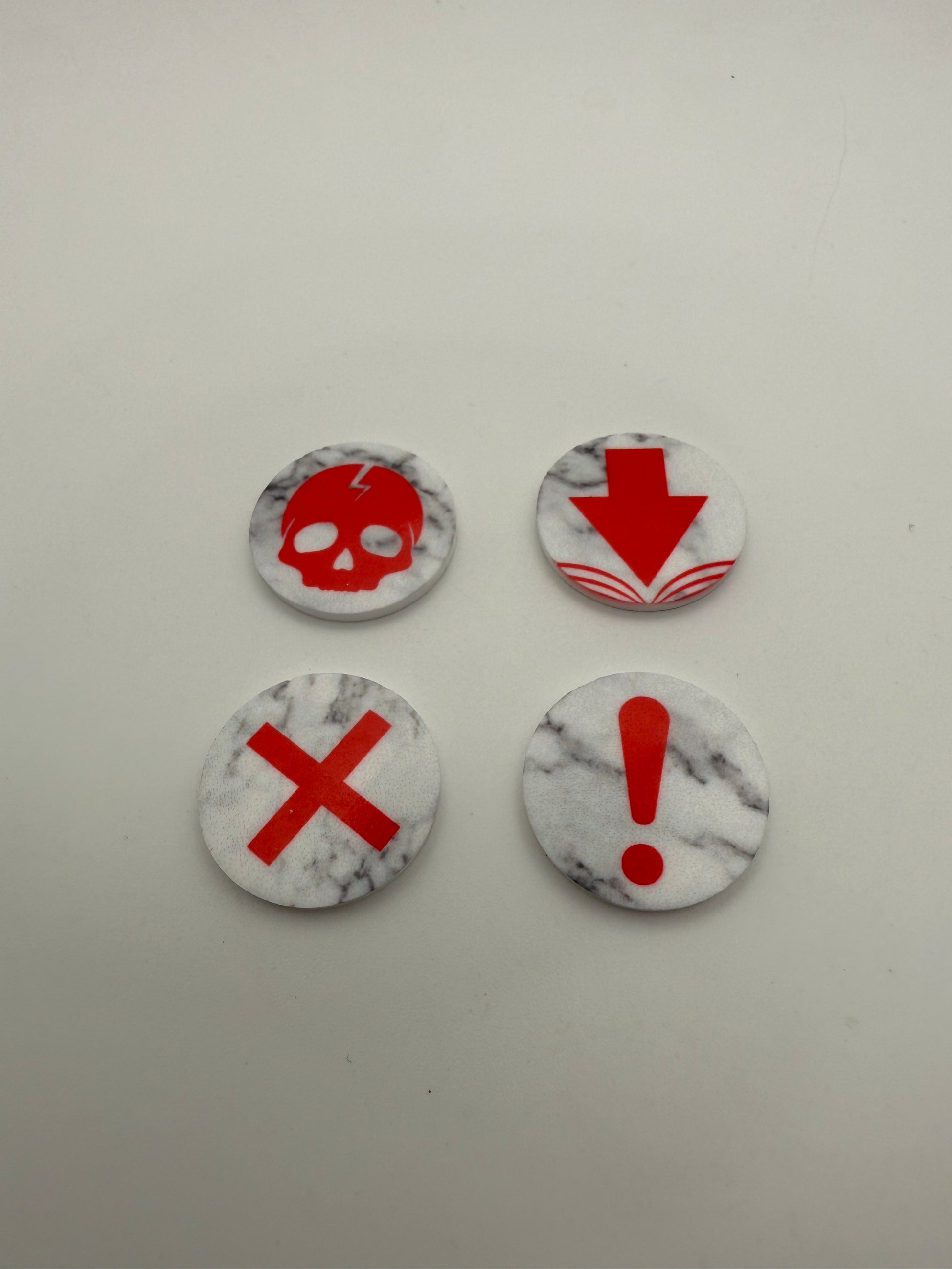 Never again will you ask 'Are these your tokens or mine?' at the end of a game! These status tokens for Heresy will withstand many a spilt beverage and will never let you forget a unit on the battlefield (unless you've had too many beverages)!