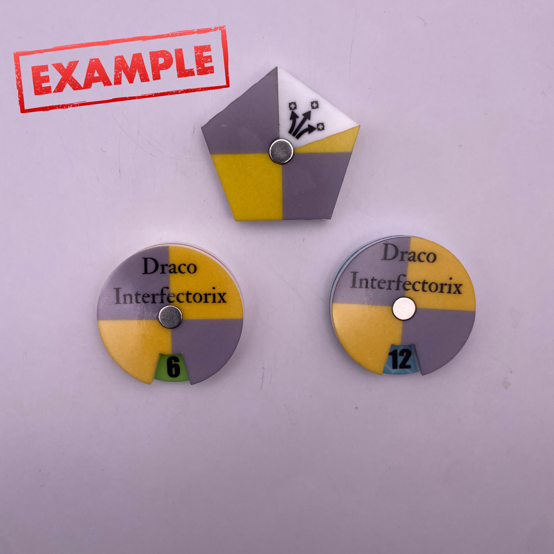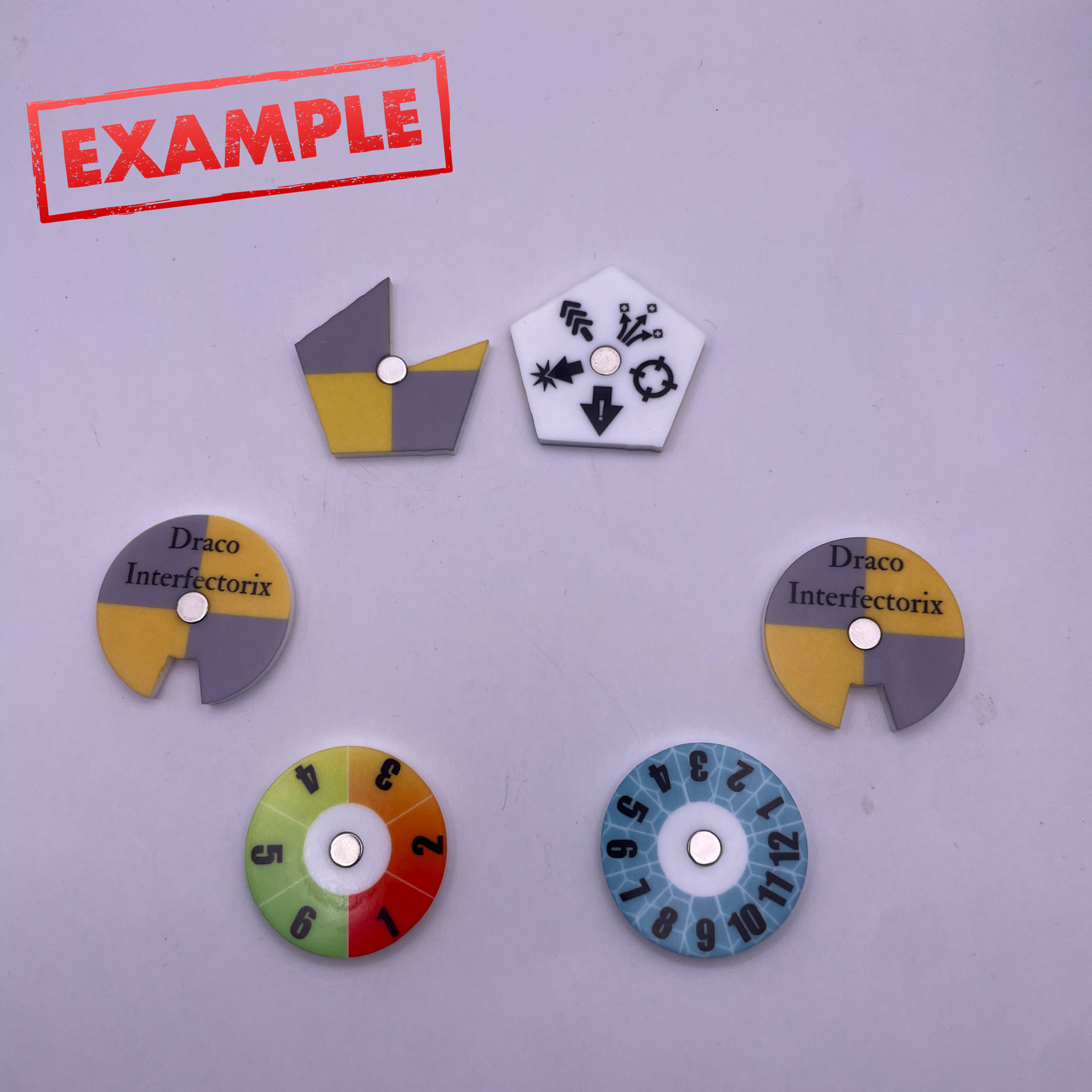 The wound and shield dials are 30mm circles and 3mm in thickness (so 6mm when they're together), each comes with 2 x 3mm magnets to hold the dial together (already firmly inserted!)
